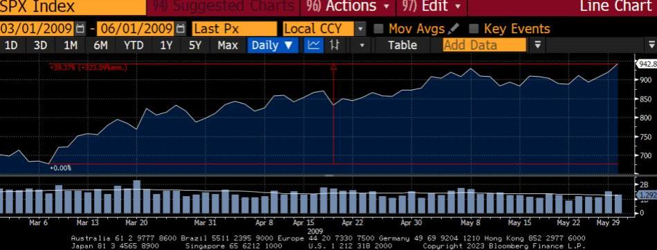 标准普尔500指数从其低点反弹了40%。对于全球交易量最大的股票指数来说,这是在短短3个月内的一个巨大变化。市场爆涨是因为它预期未来的宽松政策。如果你在2009年6月后拒绝参与,因为你认为这一切都已经被烘托出来了……那么,我为你的损失感到遗憾。?