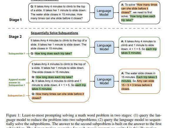 如果仔细对比CoT和之前的prompt的话,其中最大的不同是CoT模仿人类推理将过程分为多个阶段。而有些问题如组合泛化直接用CoT也不好解决。于是就提出了另一种多步推理的方法,Least-to-MostPrompting: