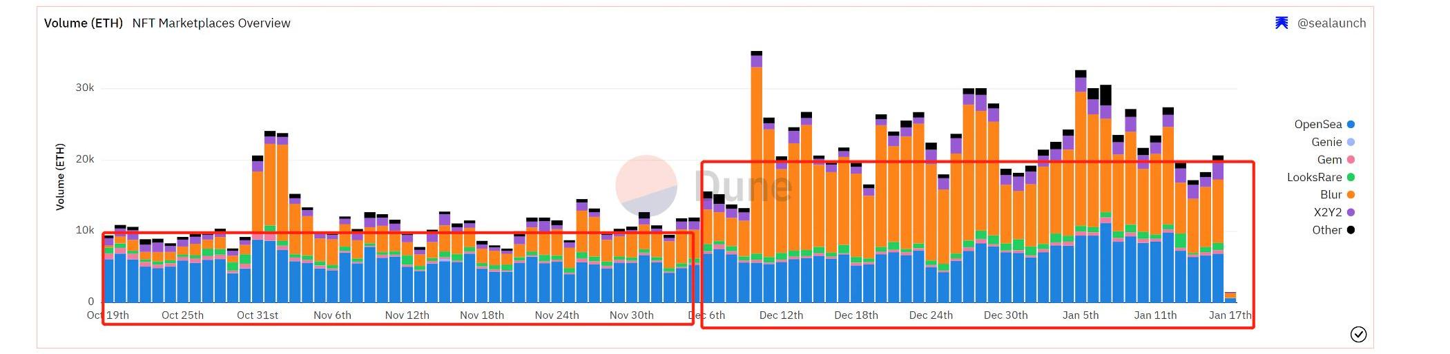 首先从赛道的基本面情况来看,nft市场的交易量12-1月间对于10-12月的提升在1倍左右,从10k的日均交易量提升到了20k。但这是以eth为本位的,如果按u本位,比起10-12月,还要提升40%—50%的涨幅溢价,最终呈现的交易量提升应该是1.5倍左右。