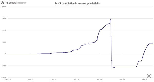 Maker协议去年增发了2.1万枚MKR代币,旨在抵消此前累积的MKR赤字也使MKR供应量过剩了近9个月时间。