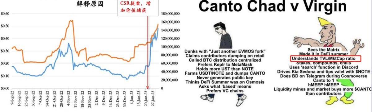 可以看到,在CSR提案通过后,最先反应的是CantoDex的TVL,随后是Lending,最后总TVL迅速提高。但TVL和价格之间只是有相关性,并不代表TVL可以解释币价。TVL和币价都是结果,而不是原因。