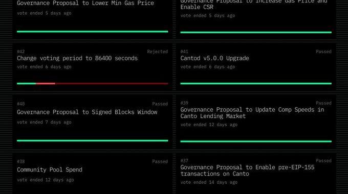 仔细了解,会发现:社区的提案进程非常快、且非常多,一个月有5-10条提案。投票非常积极,是一个积极的信号:CantoSYN桥建立时,币价和TVL亦有齐涨现象。
