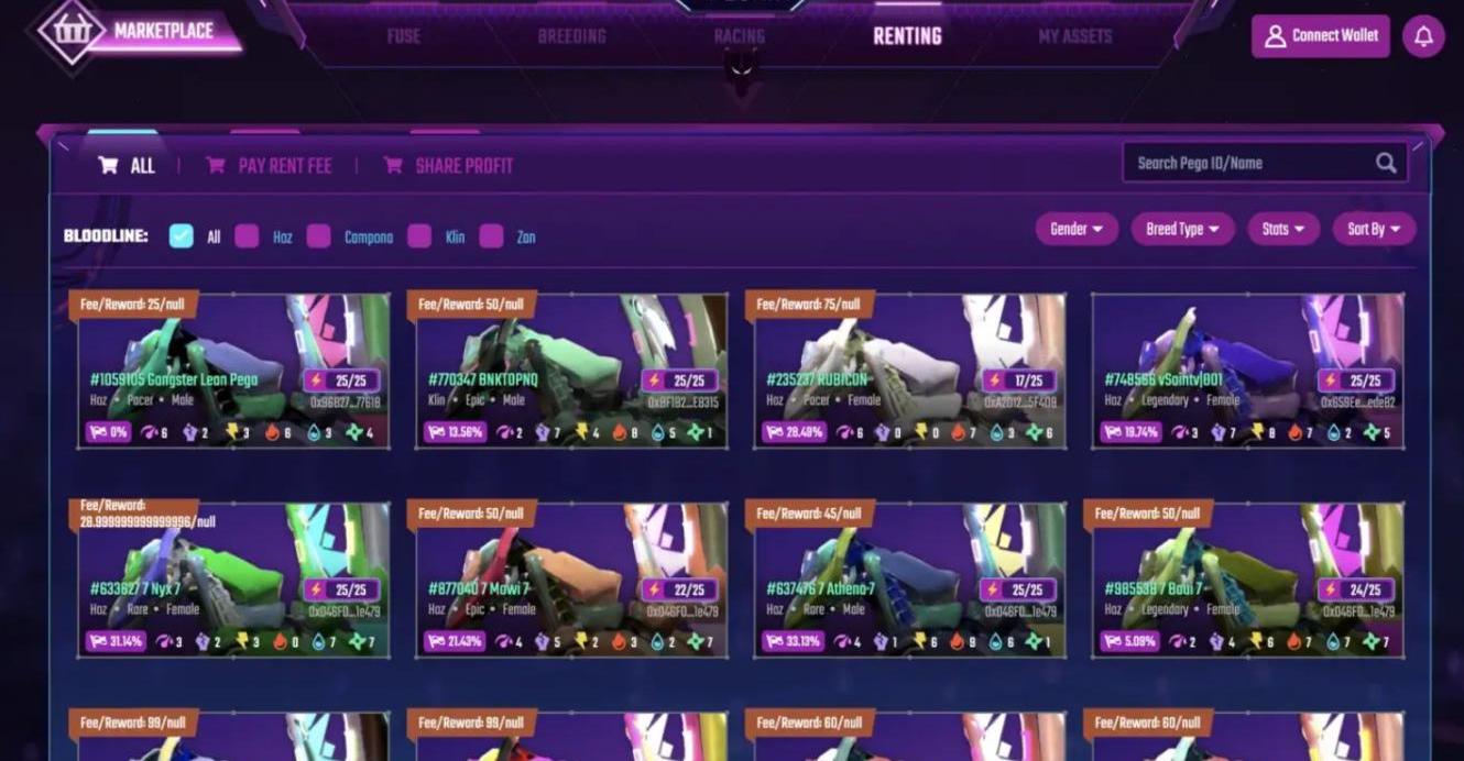 使用战略升级、食物和技能,玩家必须进入前3名才能获得平台的实用代币VIS。在游戏中,玩家可以繁殖、合并、出租、出售和竞赛他们的Pega以赚取VIS代币,该系统使团队能够建立大型公会和奖学金计划,甚至为单人玩家提供通过每日比赛获得游戏内代币的机会。