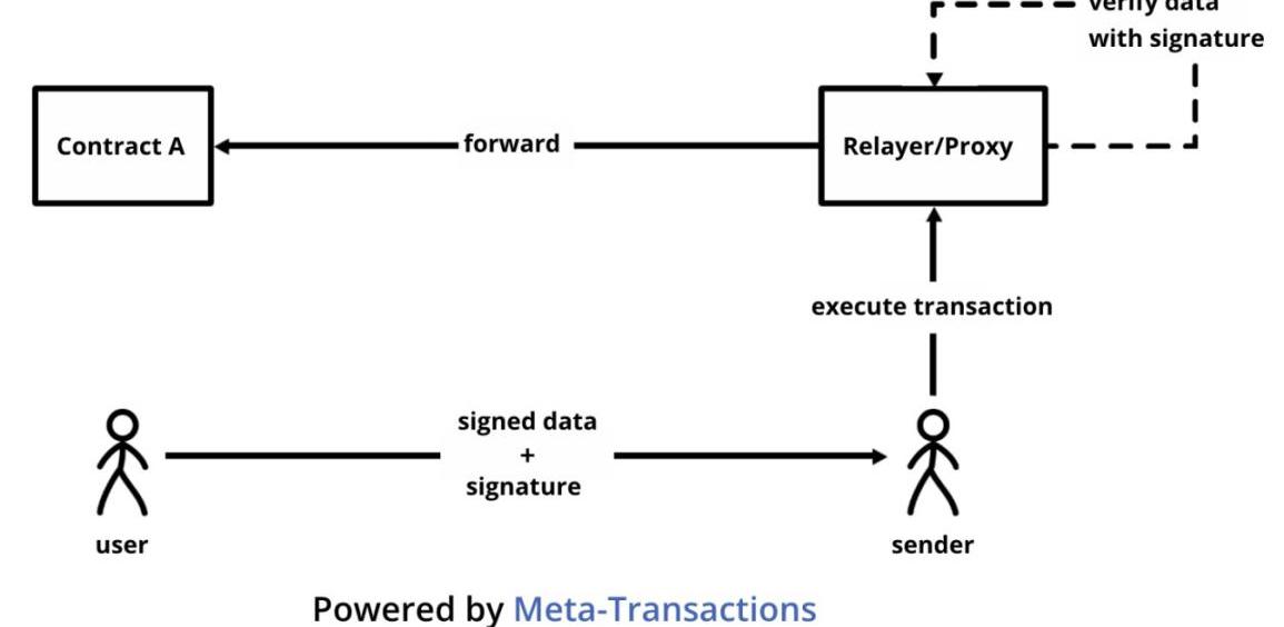 由于交易只能从EOA开始,为了改善用户体验,通常智能合约钱包会提供中继服务,从用户那里获取签名消息并从服务提供商的EOA提交到链上,其自定义费用机制可以将ETH退回给用户的EOA钱包实现免Gas费用。