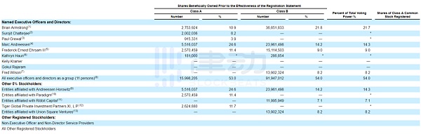 根据文件披露,当前 Coinbase 第一大股东是联合创始人兼 CEO Brian Armstrong,占比 21.7%;此外,股东名单中还有知名风投机构 a16z 关联实体,投资过 Twitter、Tumblr 等知名企业的联合广场风投(USV)关联实体,以及 Ribbit Capital、老虎基金和 Paradigm 等大家熟知的风投机构。