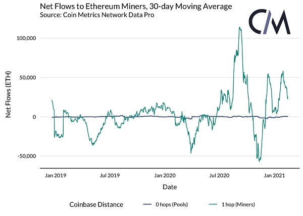 除了观察矿工持有量外,我们还可以分析进出矿池地址的流量。虽然这些流动在很大程度上是微不足道的,但它们对下一节讨论的更广泛的矿工流动的背景很有用。就像比特币一样,以太坊池地址处理的交易量相对较小,流入和流出一般是同步进行的。