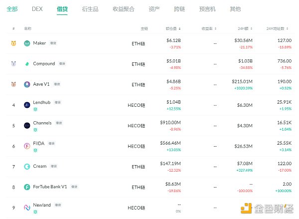 锁仓量排名前十的借贷平台 排名来源:DeFibox