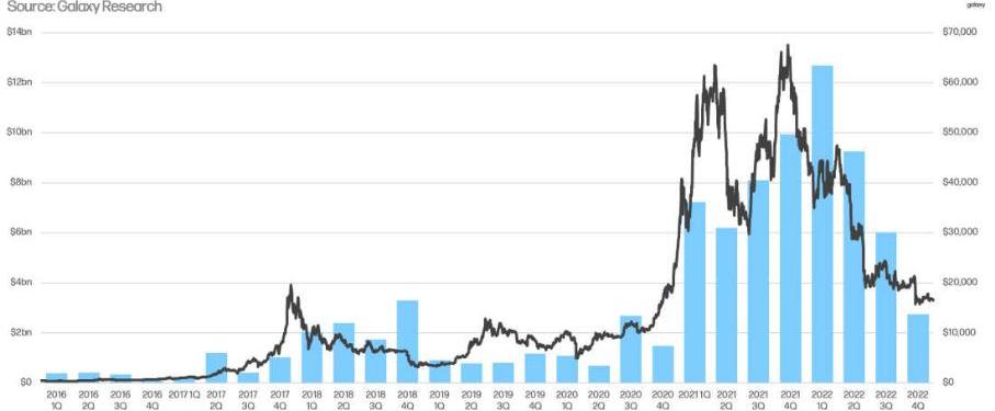 风险投资的发展趋势继续跟随比特币的价格表现,比特币价格在2022年第四季度创下近年的低点,VC投资也在第四季度创下低点。
