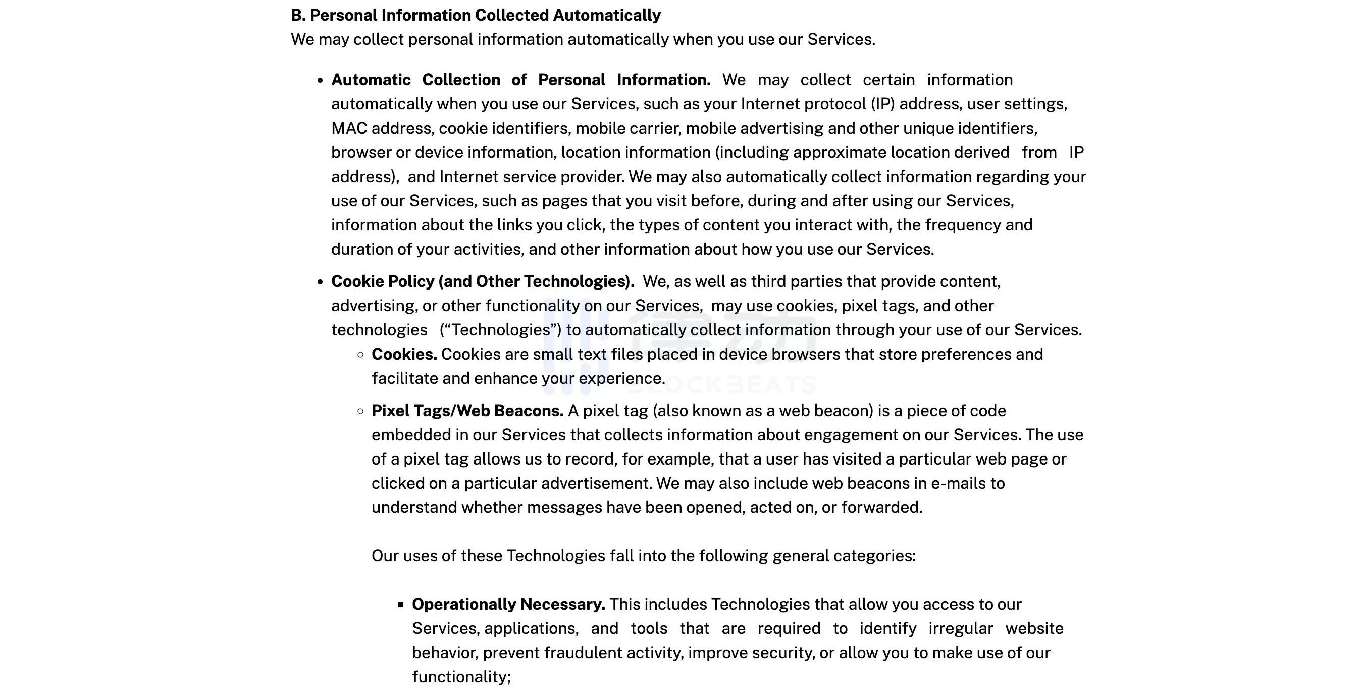 文件显示:「当您使用我们的服务时,我们可能会自动收集某些信息,例如您的IP地址、用户设置、MAC地址、cookie标识符、移动运营商、移动广告和其他唯一标识符浏览器或设备信息、位置信息以及互联网服务提供商。我们还可能会自动收集有关您使用我们服务的信息,例如您在使用我们服务之前、之后访问的页面、您点击的链接信息、您互动的内容类型、您活动的频率和持续时间,以及有关您如何使用我们服务的其他信息。」