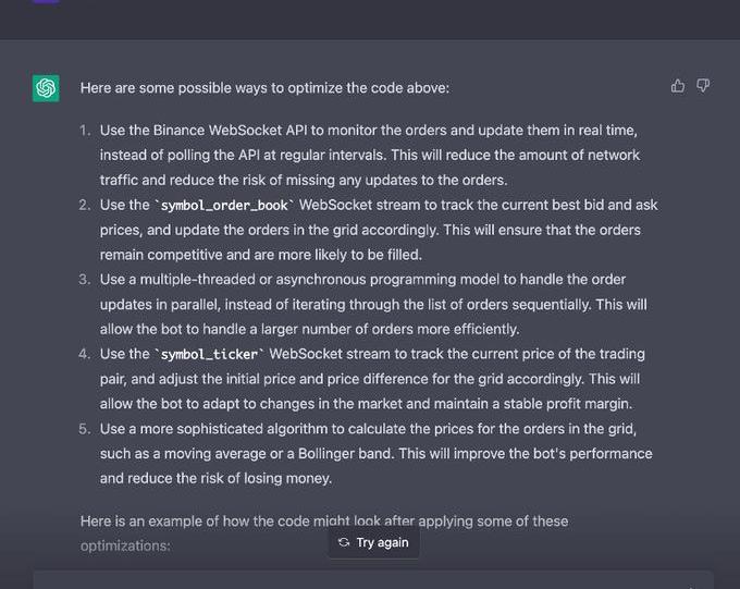 1.通过一些input调教,chatGPT真的可以写出一个非常基础但是基本可用的girdtradingbot,并且能进行一些基础的优化。2.更加出乎我意料的是,它竟然还能写出一些简单的MEVBOT,甚至可以调用不同的api去写满足不同条件的MEVBOT