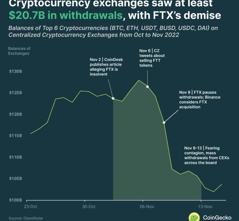 coingecko报告显示,CEX资产余额从11月2日的1236亿美元下降到11月13日的1028亿美元,减少了207亿美元。在不到两周的时间里,排名前六的主流CEX余额下降了约16.8%,CEX信任危机爆发,资产存储量出现断崖式下跌。