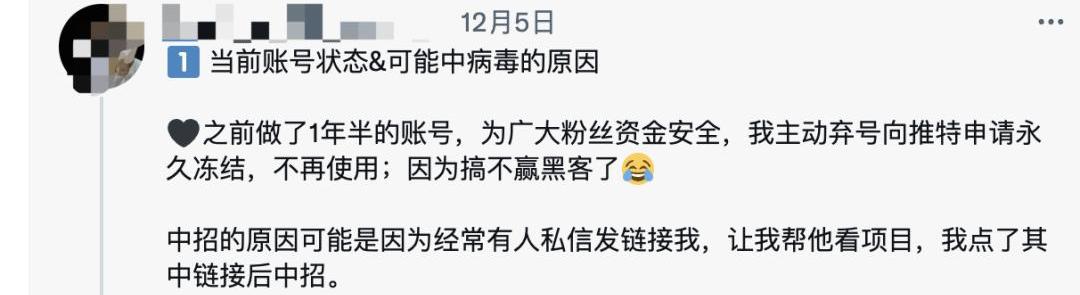 推特KOL点击别人私发链接,导致推特账户被盗,然后发布带空投信息,利用粉丝对KOL的信任点击链接盗走粉丝资产。