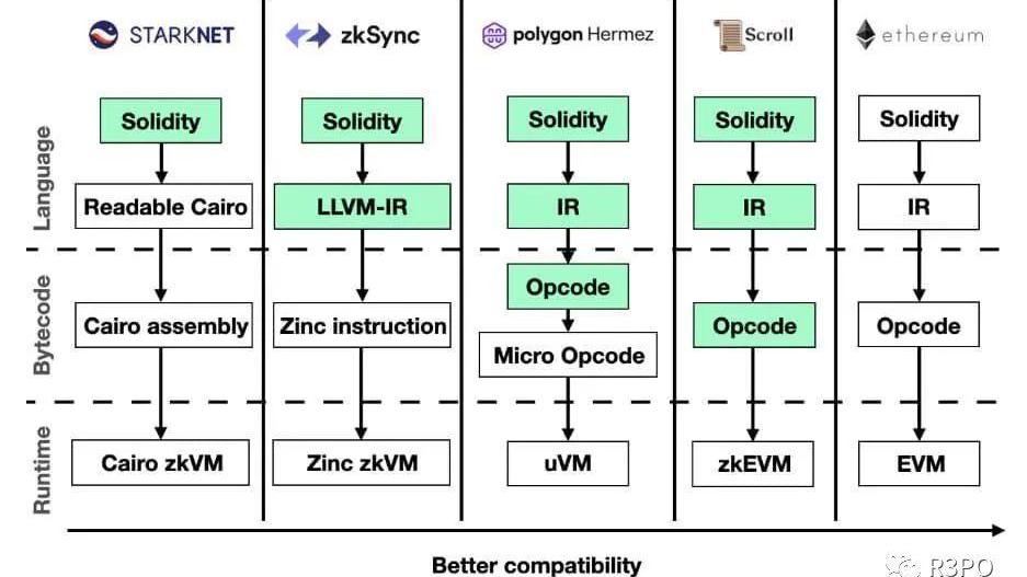 这也是ZKVM和ZKEVM的竞争方向,Vitalik曾给出不同的EVM分类的兼容性和性能表现关系,可以发现,越底层的实现兼容性越强,但其性能表现则会越差,这个道理其实很简单,联想下以太坊主网那可怜的性能和极强的安全性便可明白机理。