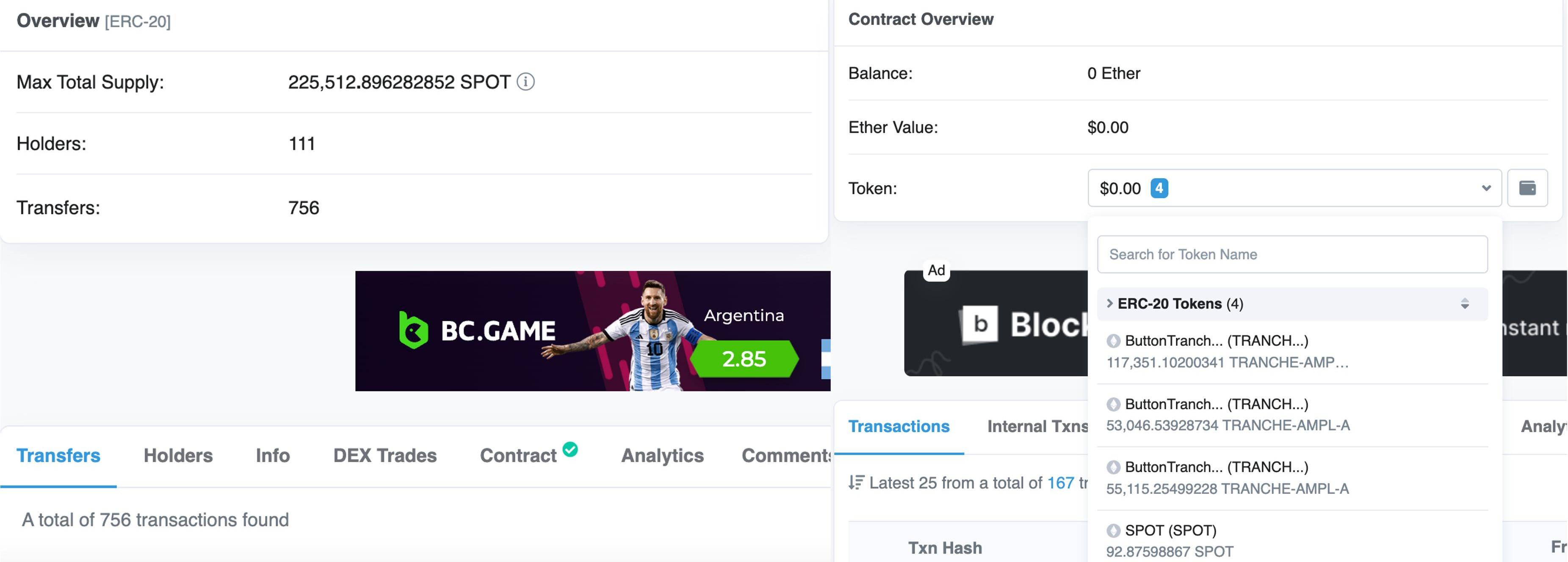 从区块链浏览器上的数据看,SPOT和A-Tranche的数量是对应的,每存入1A-Tranche即可铸造1SPOT。截至12月16日,SPOT的发行量为225512枚,抵押品包含3种类型的A-Tranche。那么用户赎回时,也会同时得到这3种抵押品。