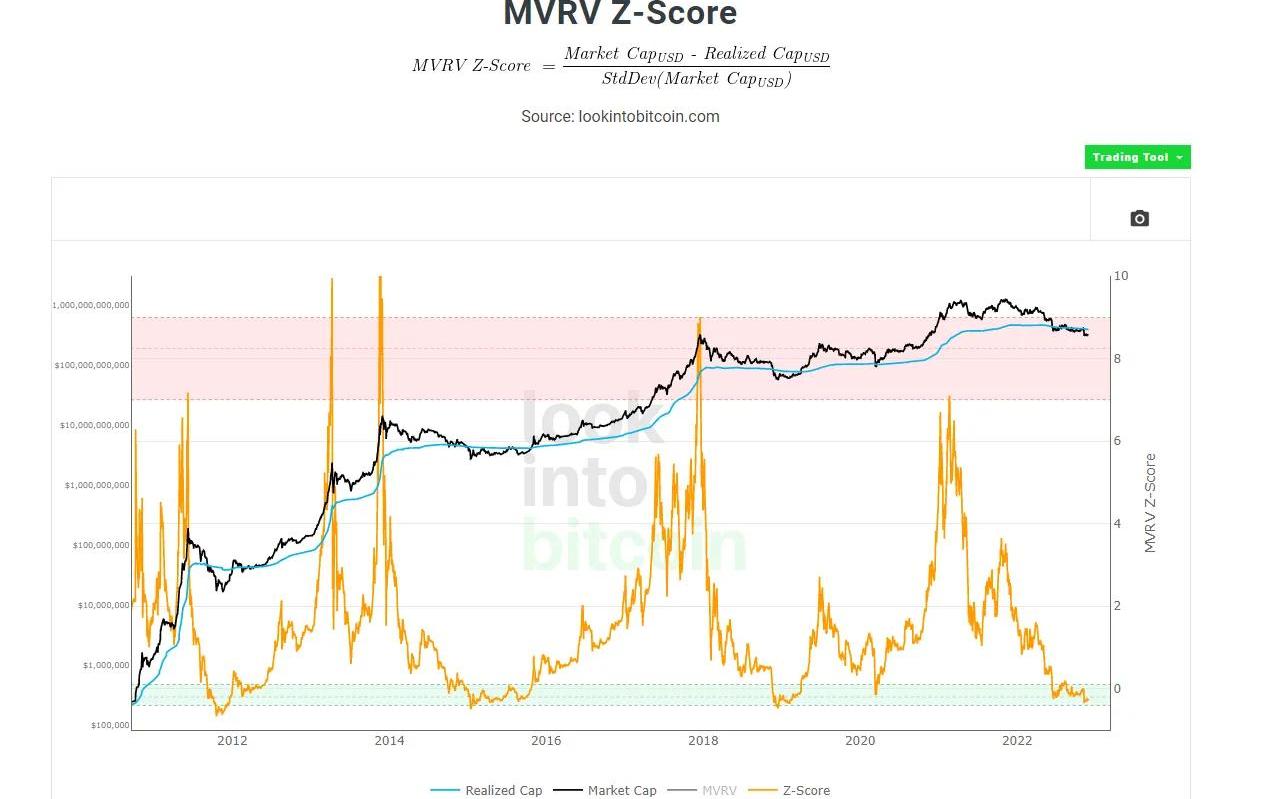 首先是比特币的?MVRVZ-Score。该指标衡量的是市场价值与实现价值的关系,并使用标准偏差测试可以剔除数据中的极端值。