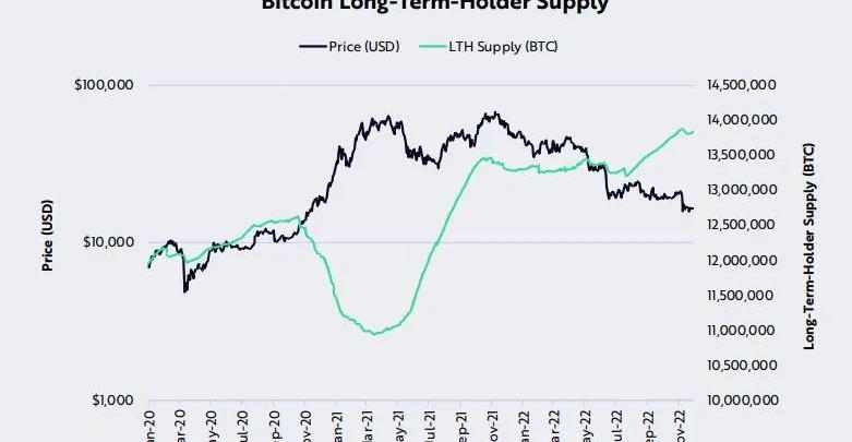 综上所述,比特币数据正在全面闪烁着触底信号。最后,这是一个关于长期持有者的积极信号——“持有者”仍在持有。目前,有72%的流通供应在过去155天或更长时间内没有移动。