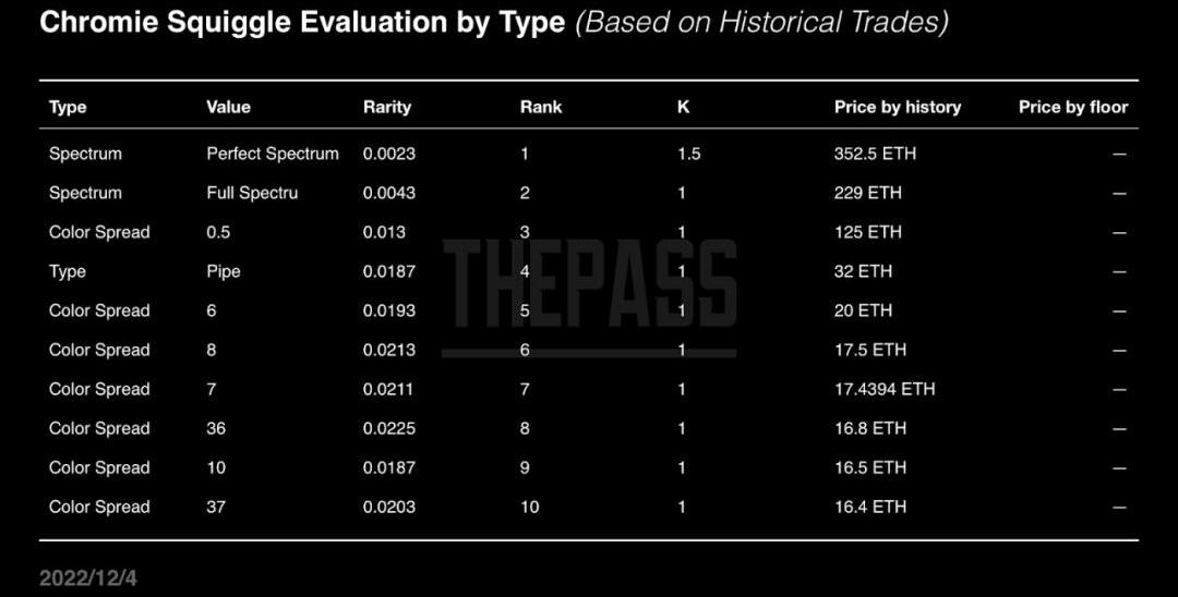 上图可看出单个艺术家同一系列因为属性的不同依旧会有价格价格梯度差距,根据thepass.to数据显示,以ChromieSquiggle系列作品价格估值范围区间为8.9eth~352.5eth。按照不同特质我们可分成以下几类价格梯度。