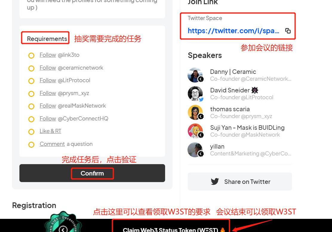 我们点击会议链接,可以看到会议的详细。参与抽奖,领取W3ST详情请看下面的截图。抽奖需要在会议开始前参与,会议结束后,可以回到这里查看中奖情况。W3ST需要满足领取要求,在会议结束后可以领取。