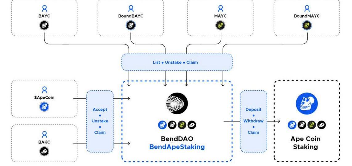 BendDAO对于绝大部分的NFT蓝筹玩家都不陌生,平稳运行了近9个月的时间,在此期间BendDAO也经历了蓝筹NFT价格的剧烈波动导致众多NFT进行清算的问题。在不久前也曾经被行业质疑是否会成为蓝筹NFT价格进入死亡螺旋下降的罪魁祸首以及坏账的解决能力等,但是伴随着产品不断迭代升级,以及通过社区提案决策修改重要参数等努力,BendDAO用数据和时间证明了其在NFTFi领域的龙头地位。因此在ApeStaking的活动中,BendDAO也是一个非常重要的第三方参与平台。