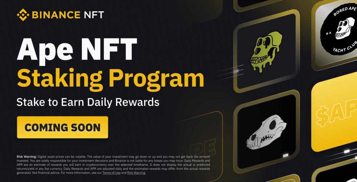 中心化交易所在ApeStaking的活动中也找到了自己的切入角度。BinanceNFT于12月6日发布公告,宣布将于12月12日开启ApeNFT质押活动。