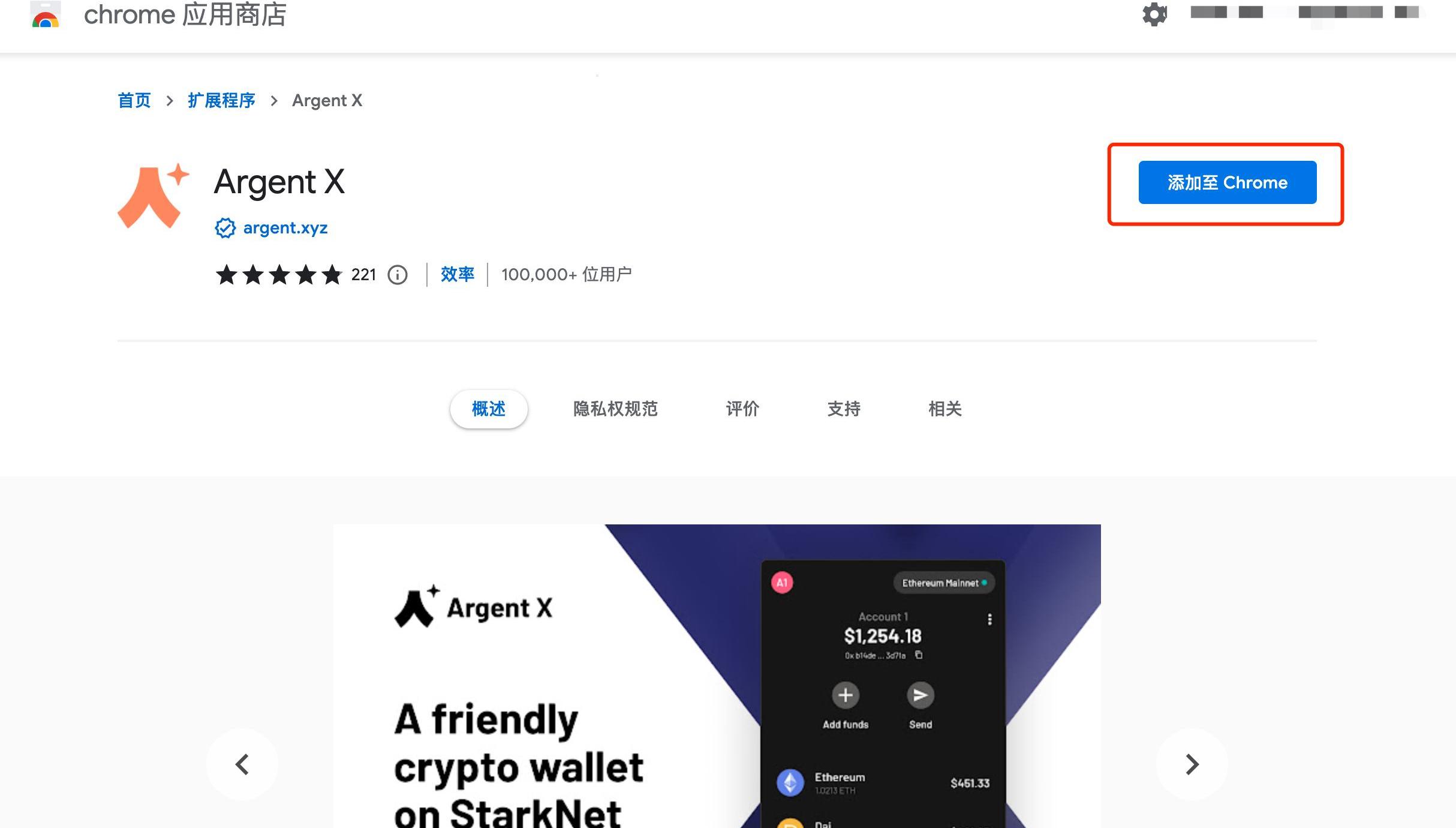 1)首先你要有一个Starknet生态钱包ArgentX。点击此处,在Chrome上添加钱包插件。