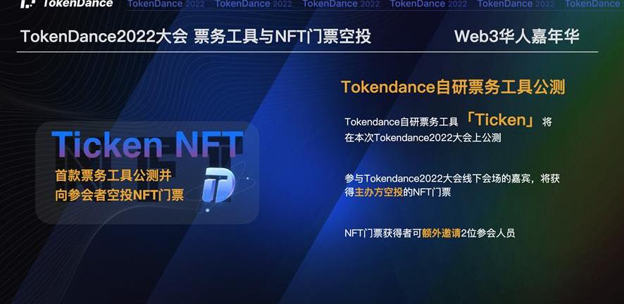 Tokendance?研票务?具「Ticken」将在本次Tokendance2022?会上公测。参与Tokendance2022?会线下会场的嘉宾,将获得主办?空投的NFT?票。实现会议数据上链,推荐会场中最匹配的人。