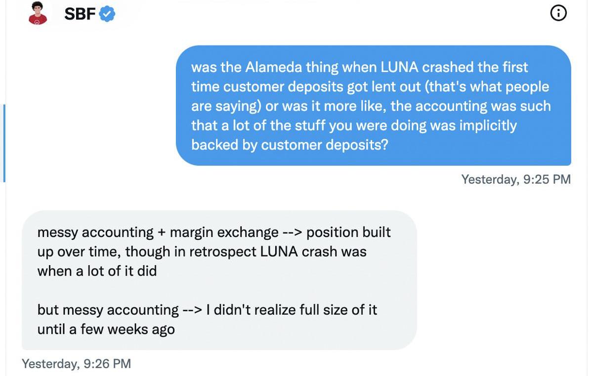 SBF坚称FTX从未将加密账户持有人的存款投资于交易所。我通过Twitter就这一点向他施压,虽然他继续坚持FTX没有以这种方式直接使用账户资金,但他同时表示,Alameda从FTX的资产负债表中借入的资金用于投资的资金远远超过他所意识到的,这最终让FTX容易受到相当于银行挤兑的加密货币的影响。