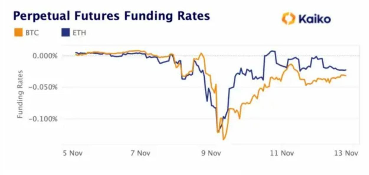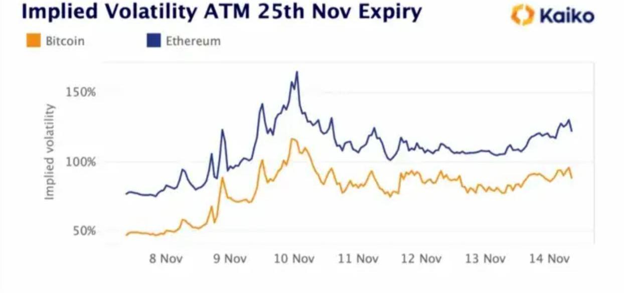 期权市场也出现突然的情绪转变,11月8日至9日,BTC和ETH期权的隐含波动率激增。隐含波动率可以衡量期权交易商对未来价格波动的预期。