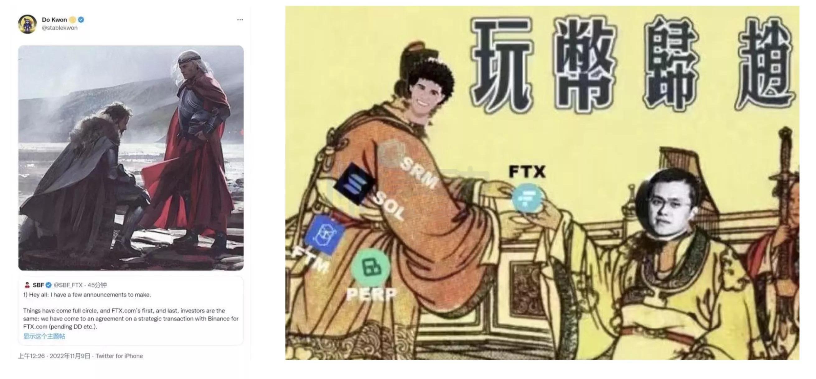收购消息公布后,两家交易平台的Token瞬间飞涨,FTT回升突破20美元、BNB突破370美元。社区则更加热闹,Meme图文梗纷纷刷屏,刹时间把CZ捧成了「加密皇帝」。