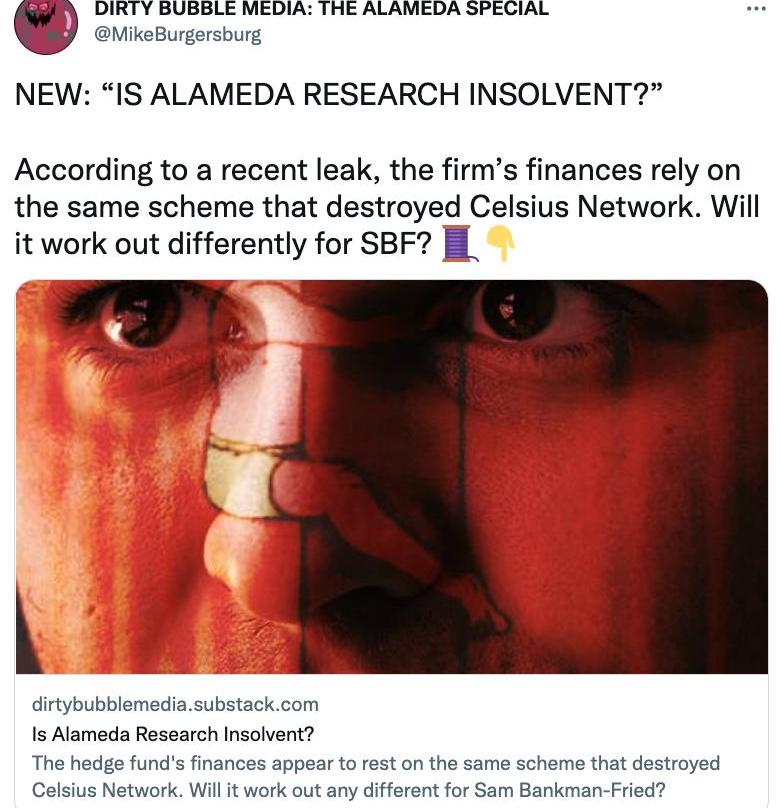 一个曾率先披露Celsius崩溃的推特账号发布一份报告,题为“Alameda无力偿债吗?”。