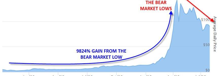 说黎明前的夜最黑暗,在塞浦路斯持续不断的金融危机中,比特币的超然地位吸引了投资者。随着恢复交易的Mt.Gox爆出新的问题,BTC在2013年4月于212.38触顶。此后一周的时间里,比特币就下跌近70%,至66下方。