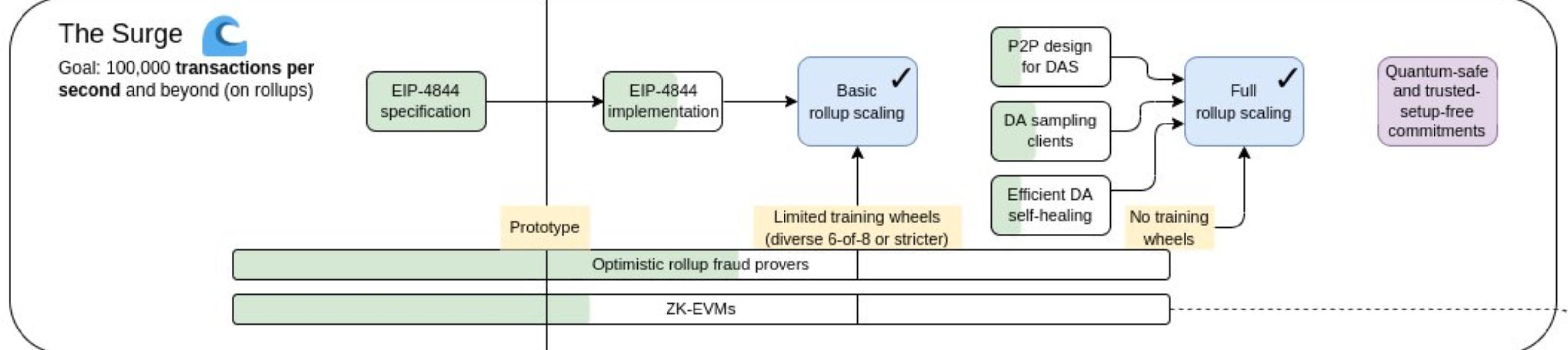 7/30第二阶段Surge挺有意思,加一个非常直观的KPI:TPS要到100,000。但是又稍显心虚地加了小括号说rollups也算哈哈。其中A里程碑是完成rollup初步扩容,而这完全依赖于EIP-4844提案。