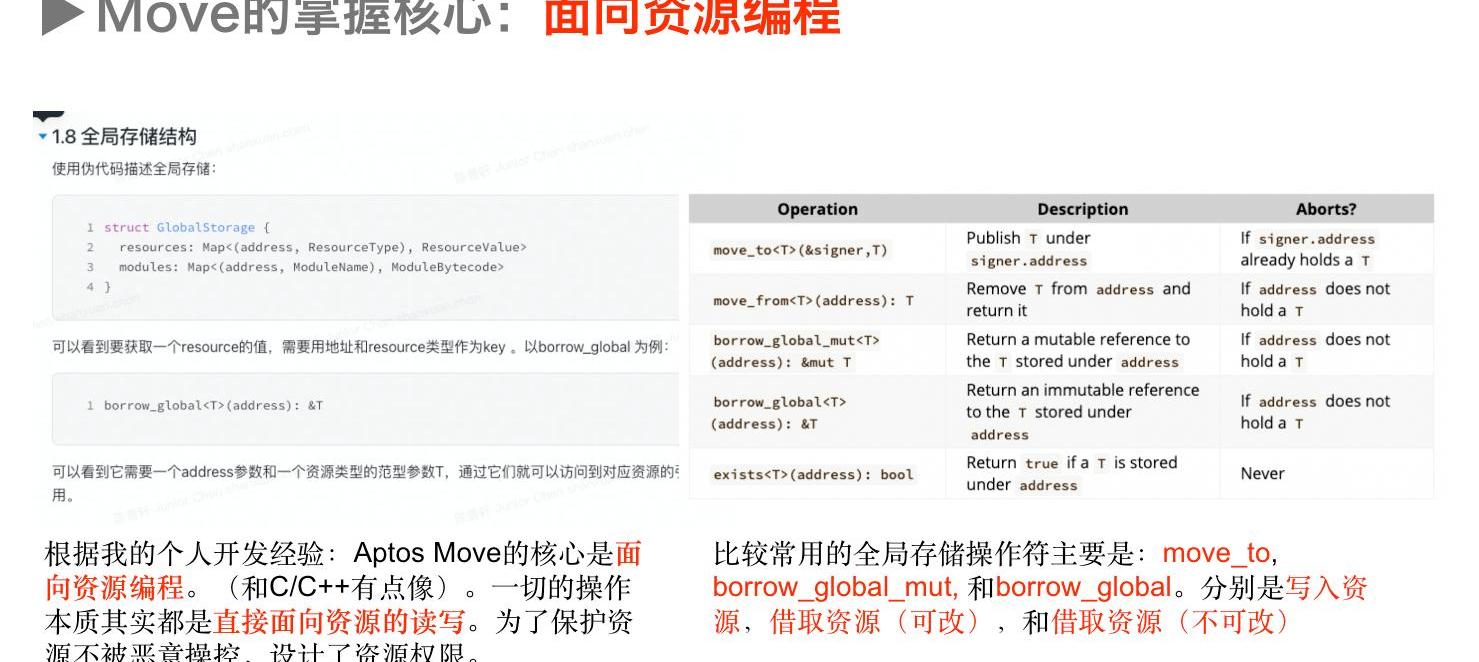 我个人觉得,除了要掌握Aptos和EVM系的存储差异之外,最重要最重要的是,理解:面向资源编程。贴一个我上周分享的一页PPT。直接面向资源的存储和写入,可以让编程开发不需要再去理解很高层的动态抽象,不需要像EVM那样理解数据存储在合约状态的逻辑,直接面向底层的存储和读取,让开发者更加清楚底层逻辑。