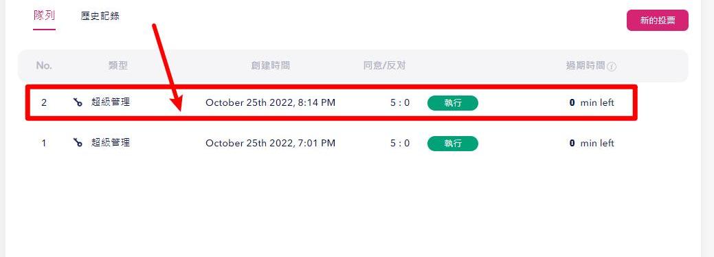 然后前往栏位,找到刚才发起的超级管理员提案,点击,小狐狸弹窗会跳出,点击确认即可。