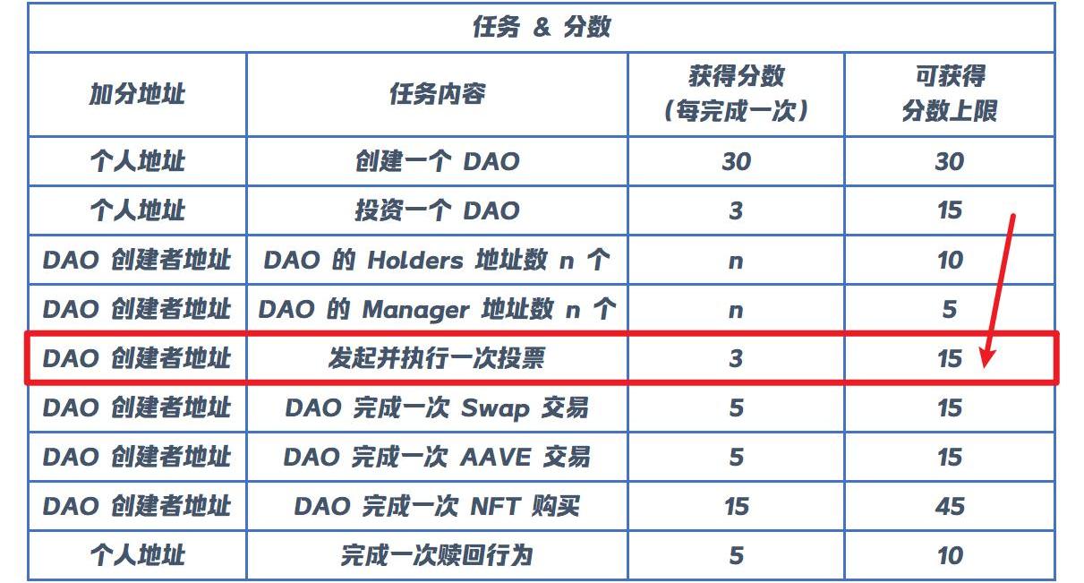 投资一个DAO可以得到3分,而最高得分上限为15分,也就是最好能投资5个DAO,而我们刚刚只投资了自己创建的1个DAO,你可以去投资另外4个陌生人创建的DAO。