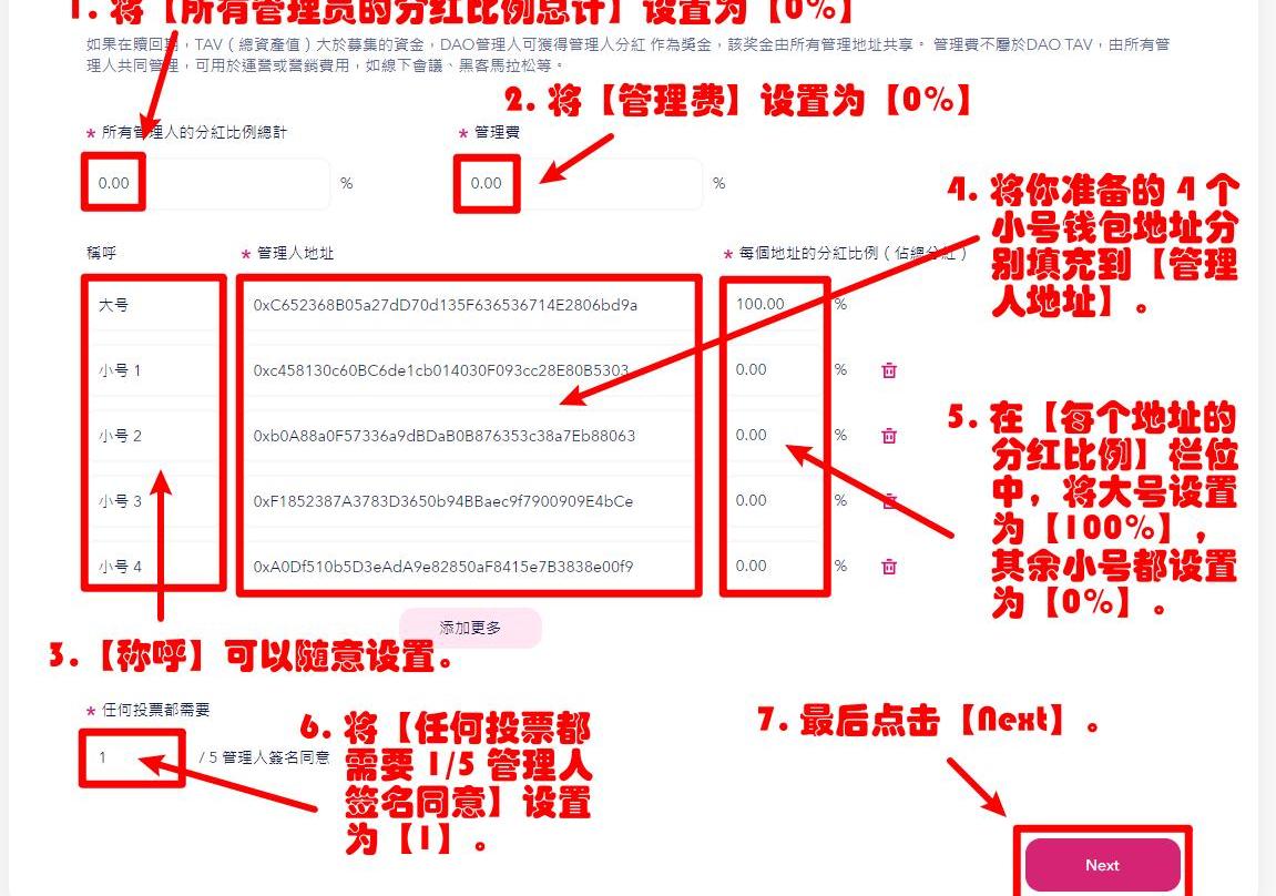 将设置为。将设置为。可以随意设置。将你准备的4个小号钱包地址分别填充到。在栏位中,将大号设置为,其余小号都设置为。将设置为。最后点击。