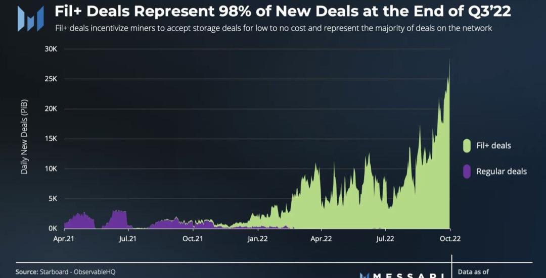 自21年第四季度以来,已从常规交易过渡到主要是Fil+交易。这一转变对应于Fil+交易的持续上升趋势,占22年第三季度所有新交易的98%以上。Fil+交易对常规交易的翻转,加上新交易的增加,表明Fil+激励机制和入职计划正在成功推动显着的网络利用率。