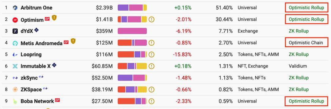 尽管Vitalik早在几年前就认定了zkEVMRollup是未来,同时各家zkEVM(Scroll,zkSync,Hermez,Consensys)也如雨后春笋一般冒出来,但?OptimisticRollup仍是目前Rollup生态的绝对主力,拥有80%Layer2的市场占有率以及前十Layer2方案的半壁江山.