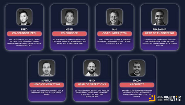 Cere 团队实力较强, 联合创始人兼 CEO Fred Jin 在 2009 年曾创建 50CUBES?游戏公司,并获得腾讯支持。在此之前,Jin 曾是知名社交网站 Bebo 的首席开发,Bebo 在 2008 年被美国 AOL 公司以 8.5 亿美元价格收购。另两位联合创始人是 Kenzi Wang 以及 Ian Duggan, Kenzi Wang 曾是火币交易所的副总裁,毕业于沃顿商学院的 MBA,CTO Ian Duggan 则毕业于麻省理工学院,并曾担任 Twitch 和 Amazon 的技术主管。
