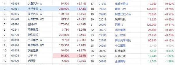 成分股中,小鹏汽车涨超9%,携程集团-S、理想汽车-W涨超5%,美团-W涨超4%,腾讯控股、小米集团-W涨超3%,京东集团-SW、哔哩哔哩-SW、快手-W涨超2%,阿里巴巴-SW涨超1%。
