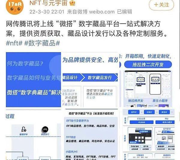 2022年3月,有媒体爆料称腾讯即将上线“微搭”数字藏品一站式服务平台,为客户数字藏品搭建一站式服务,产品包含NFT发行及管理平台、NFT钱包以及小程序/H5等,提供藏品设计发行以及各种定制服务。