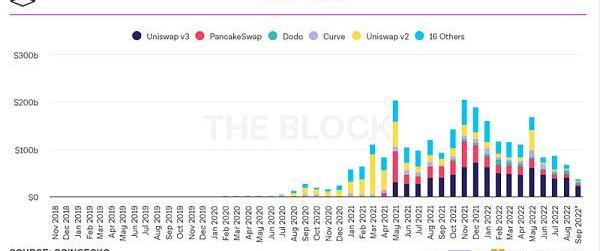 CoinMarketCap9月22日的数据显示,过去24小时只有5个DEX的交易量超过1亿美元,其中dYdX和Uniswapv3的交易量排名前两位,分别为14亿美元、12.5亿美元。