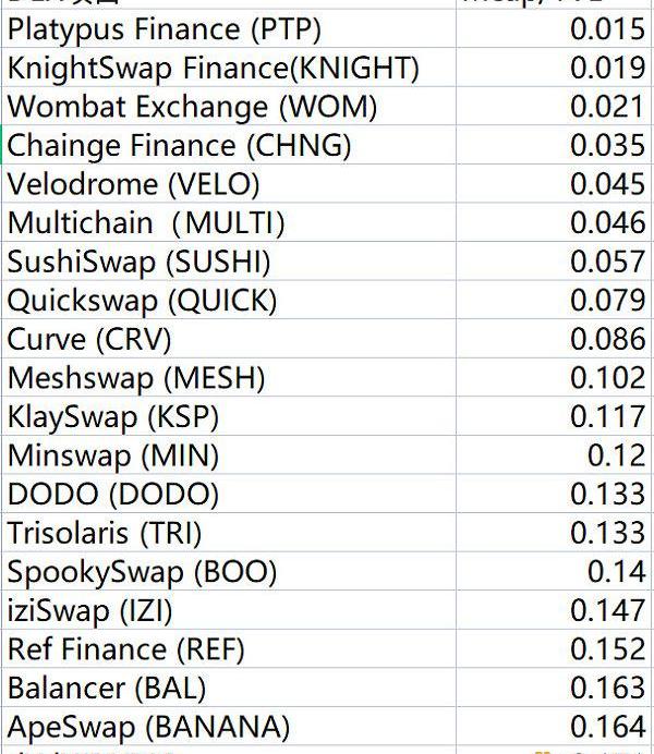市场整体低迷的背景下,Mcap/TVL的数据显示,在统计的DEX中有20个低于0.2,反映这些DEX的价值被低估,其中包括上文提到的Curve、WombatExchange、dYdX。