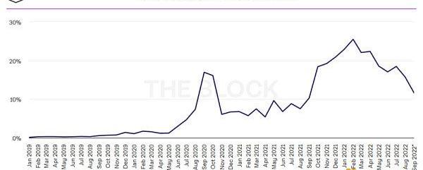 2022年以来,交易量整体呈现下滑的趋势,8月交易量为667.6亿美元,较1月的1601.4亿美元下滑58.3%。