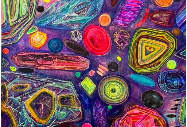 另一方面,黄宇兴极富个人特色与视觉冲击的浓烈艺术风格:具有辨识度的气泡、矿石和河流是黄宇兴作品的基础要素,它们或冷峻、或跳脱地缤纷跃动在画面上,自由组合、层层嵌套,形成高耸的山岩、涌动的河流以及瞬变的长空。作品包含了对于自然循环的思考、对生命哲学的诠释以及对中国意蕴东方美学的禅意表达。
