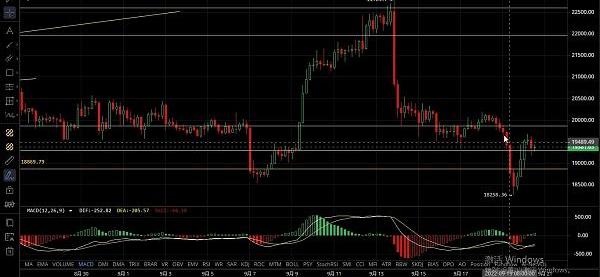 比特币昨日低位跌至18258一线未能延续下行,随后走出震荡上行晚间行情给到进场机会随后顺利下行至18880一线,恭喜跟上空单的币友获利500美刀,小时级别布林带三线缩口行情触及下轨回升,macd绿色能量柱空心转实心说明多头减弱空头增强双线有死叉迹象,目前关注布林带中轨及上轨压制,四小时级别行情走出四连阳后以十字小阳线收尾,短期出现顶部,下方关注中轨支撑,macd多头运行但反弹力度不大且延续性不强,日线仍是下行趋势后市思路建议高空为主,19800-20200空,激进现价打底,目标19000-18500-18000看新低