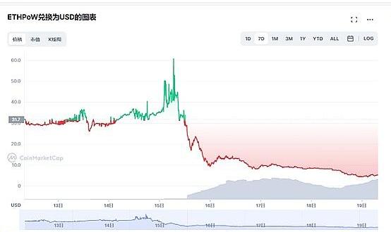 在合并之后,ETHW飙升至60.68美元,此后一路下跌,直到19日10:50跌至7日内最低点4.2172美元,共下跌超过93%,目前回调至5美元。