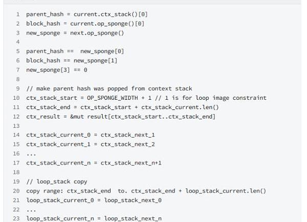 其中executor是按照codeblock来一块一块执行。在本例子里,首先执行了一个spanblock。之后在第32步时执行if-else-end结构进入了swtichblock块,并将之前的spanblock的最后一步执行生成的spongehash压入ctx_stack,并在swtichblock块执行完之后,在第49步弹出到sponge里。
