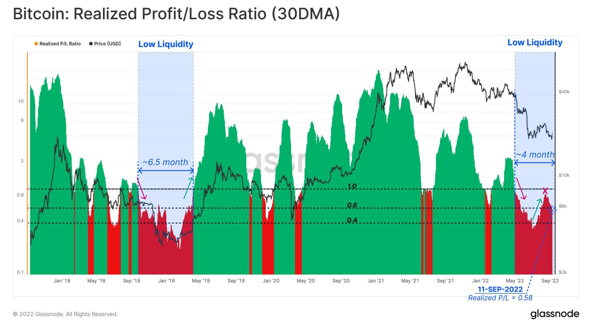 跌破到恢复1.0水平之间这一段时期是看跌情绪达到顶峰的时候,这是需求流动性不足导致的。从流动性的角度来看,当前的低流动性始于约4个月前,可以与2018-2019年熊市经历的6个月期间相比较。