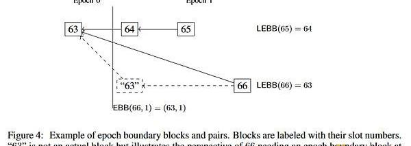见证者的见证消息中不仅包含对当前最好区块的投票,还包含了引向这个区块的最新一个检查点。需要指出的是,在Gasper中,检查点是基于时段而非区块高度的。每个时段都指向具体的一个检查点区块,要么是这个时段的第一个时隙中的区块,要么是这个时隙以前的最新一个区块。理论上来说,同一个区块可以是两个不同的时段的检查点,所以,检查点使用(epoch,block)对来表示。在下图中,“EBB”是“时段边界区块”的缩写,表示一个时段的检查点;而“LEBB”则是“最新的时段边界区块”的缩写,表示整体上最新的一个检查点。
